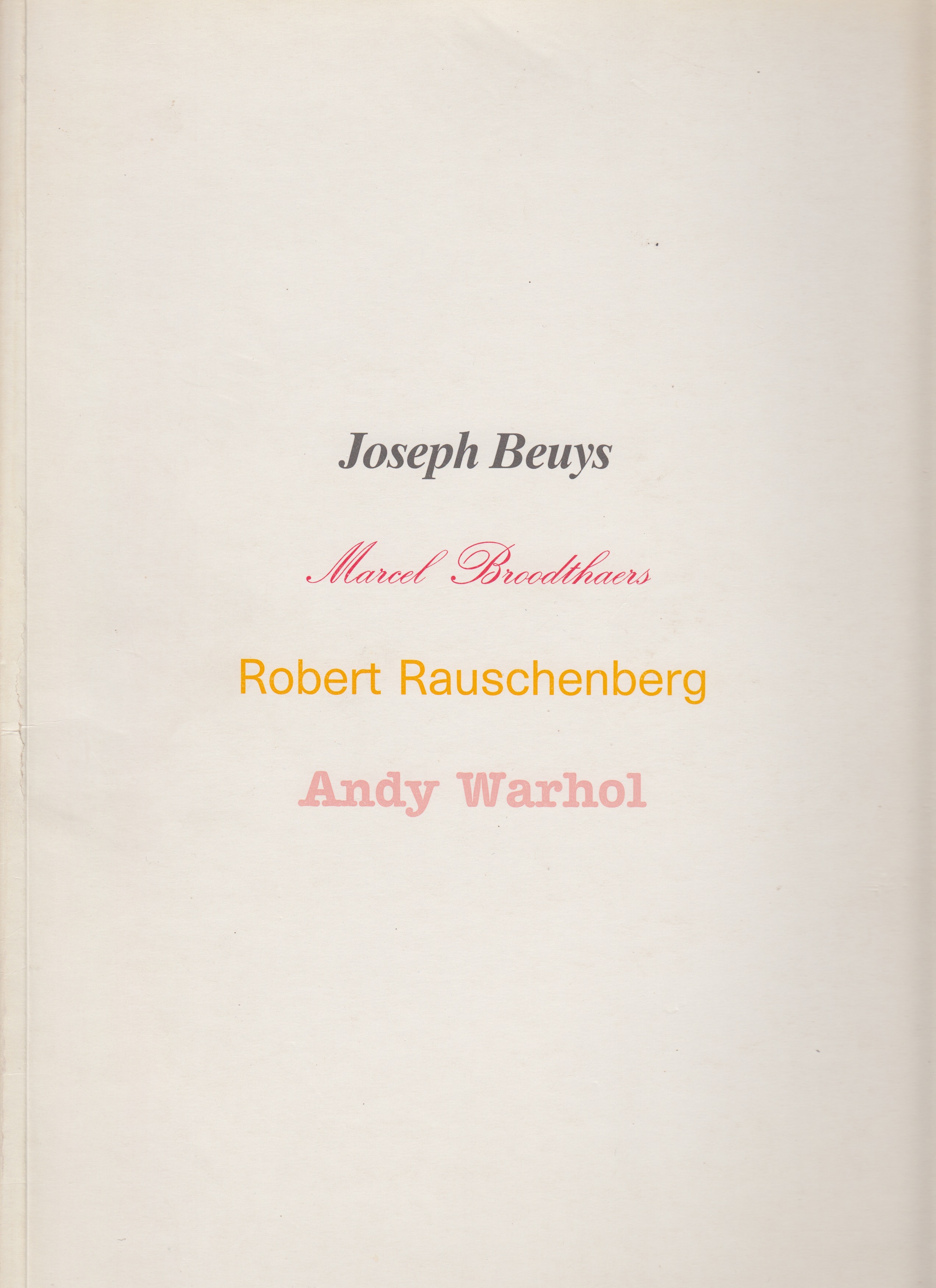 While Joseph Beuys, Marcel Broodthaers, Robert Rauschenberg, and Andy Warhol are not a “group” in the formal sense, they are tightly connected through postwar avant-garde art, especially the shift from modernism to conceptual, media-aware, and socially engaged art in the 1950s–70s. This is a catalogue of their works from a show presented at Galerie Isy Brachot in Paris.
